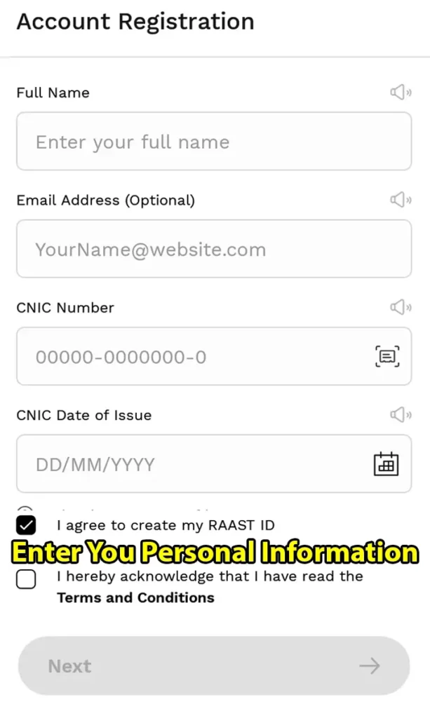After the OTP is verified you have to enter your account information in which you have to enter your name, email number, CNIC number, and CNIC date components. You can enter all these information or you can scan your ID card.